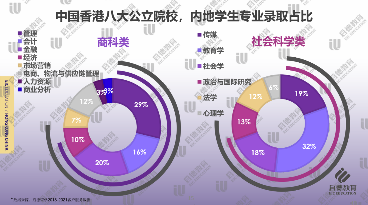 在社會科學類學科的細分專業(yè)中,教育學(32% )、傳媒(19% )和社會學(18% )的錄取占比較高。由于教育類專業(yè)在內(nèi)地就業(yè)形勢好,香港院校不僅教育學排名靠前,還擁有適合內(nèi)地學生的中文教育及對外漢語教育等課程,教育學專業(yè)在文科生中比重一直居于首位。隨著新媒體行業(yè)的崛起,處于亞洲龍頭地位的香港傳媒專業(yè)也是倍受歡迎。而“公考熱”的持續(xù)使得希望提升學歷背景的學生,會考慮繼續(xù)深造社會學、政治與國際研究此類課程。