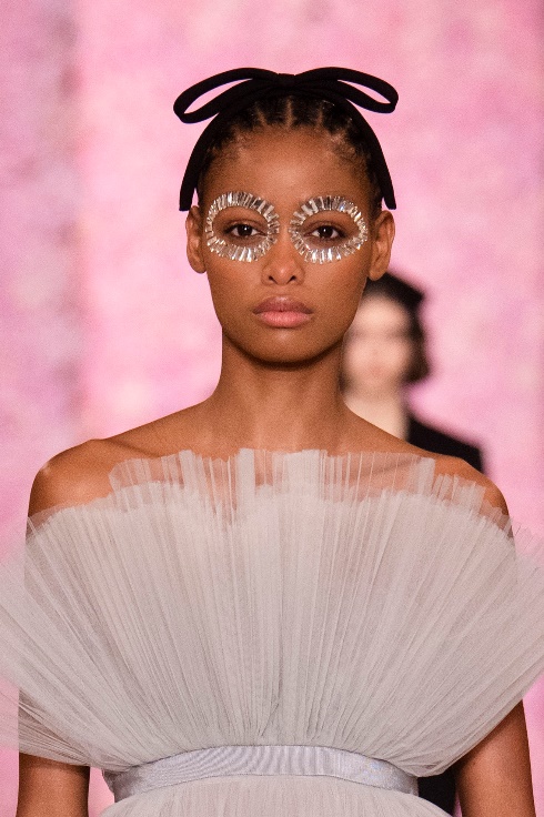 秀場(chǎng)上璀璨奪目的創(chuàng)意水晶元素面部裝飾,均出自化妝師伊莎瑪雅·弗倫奇(Isamaya Ffrench)之手。她選擇了不同尺寸的透明長方平底石和天宇長方平底石,并將它們以畫框的形式點(diǎn)綴在模特眼周,交相輝映出無限純凈光彩。
