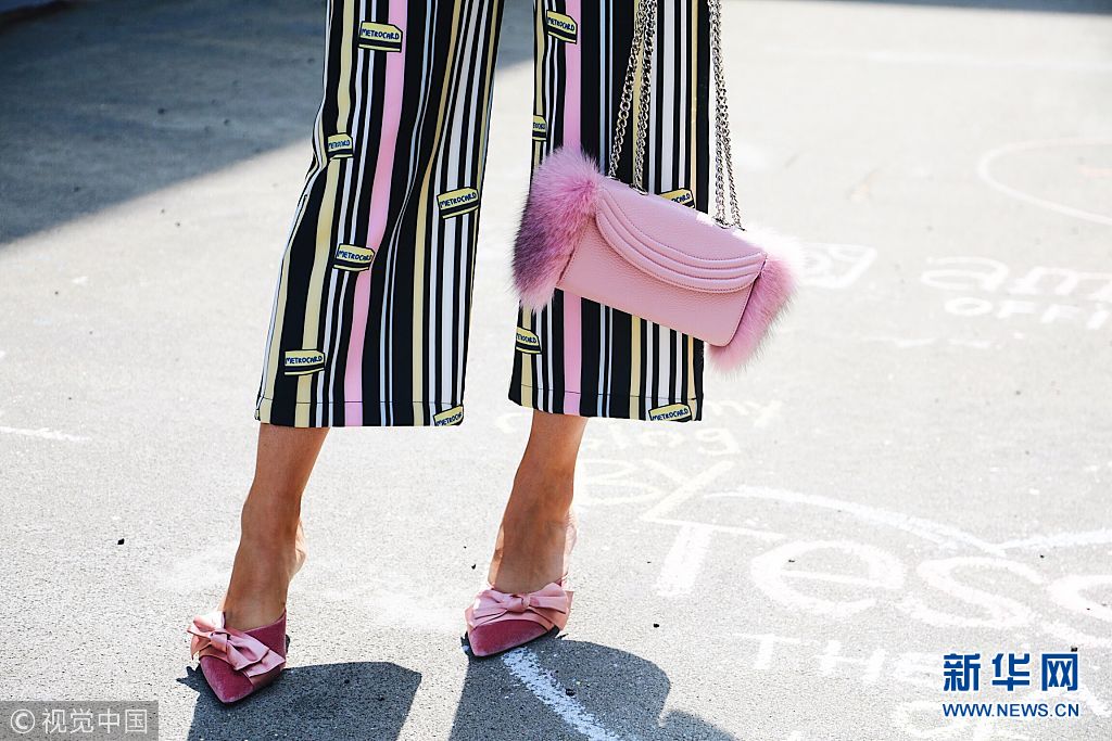 ??? 2016秋冬巴黎高定時(shí)裝周:街頭潮人(7月5日)。 粉色,流蘇,蝴蝶結(jié),魚嘴,一字帶,綁帶,高跟鞋,涼鞋。(圖片來(lái)源:視覺(jué)中國(guó))
