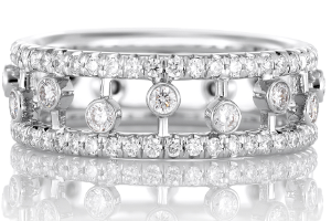 De Beers戴比爾斯Dewdrop鉆石戒指 –112顆鉆石宛若清爽的晨露,輕輕浮動(dòng)在兩個(gè)密鑲18K白金戒環(huán)之間??傊兀?.95克拉。