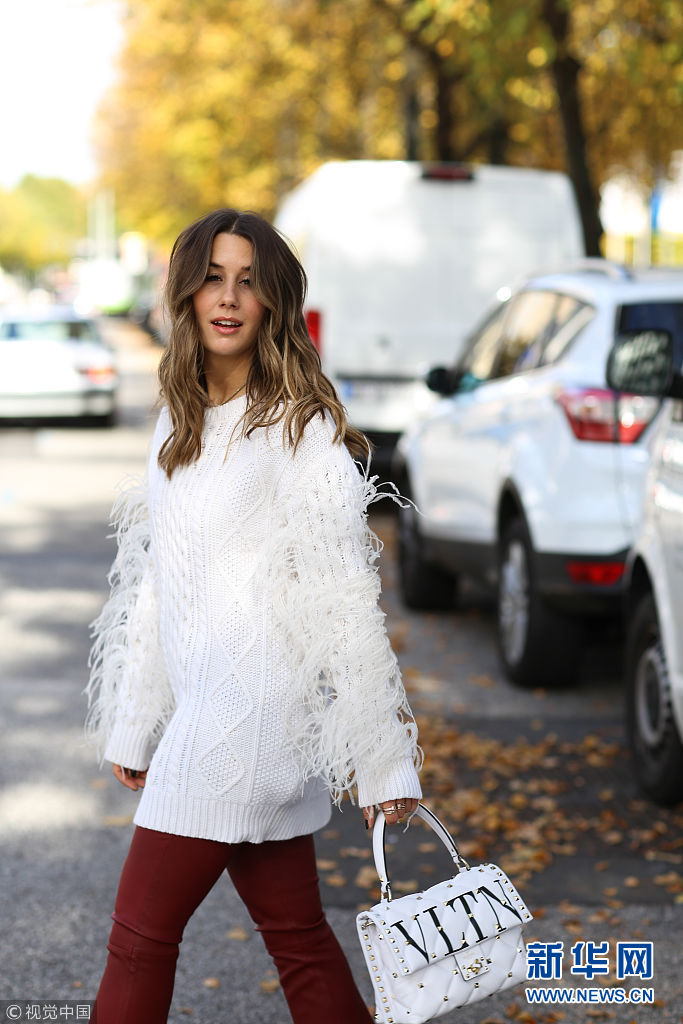 時(shí)尚博主Janina Pfau街拍。毛袖毛衣,手袋,發(fā)型:長發(fā),卷發(fā),中分,棕發(fā),挑染,上衣:毛衣,白色,毛毛,鴕鳥毛,毛袖,長袖,配飾:手袋,手拎包,白色,字母,logo,印花,鉚釘包,白色。(圖片來源:視覺中國)