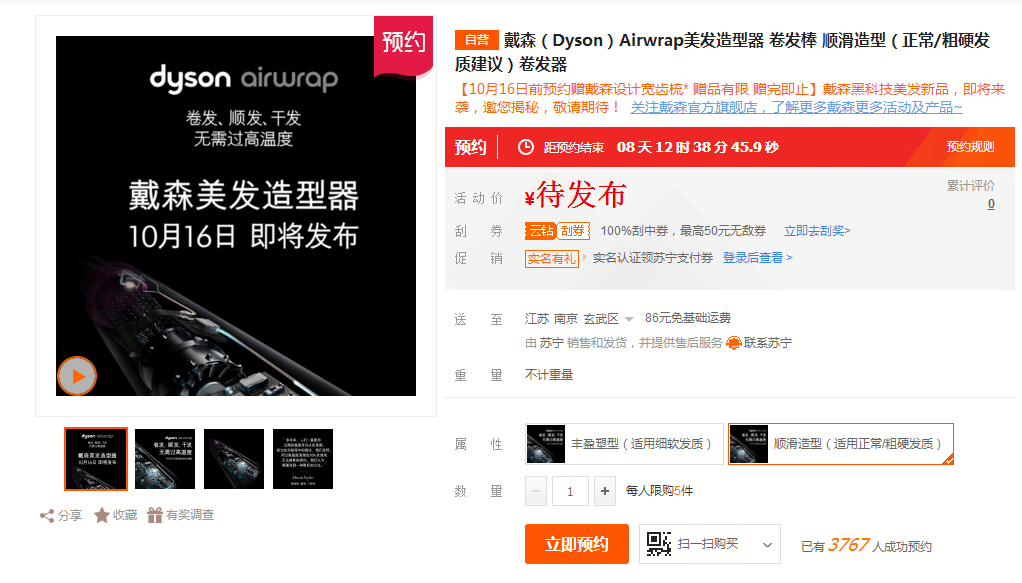 目前,戴森Airwrap美發(fā)造型器已在蘇寧易購開啟預(yù)定,10月16日正式公布售價,10月24日付尾款,即可可親自體驗,16日前預(yù)約,還可得戴森設(shè)計寬齒梳。 (吳艷 通訊員/黃敏君 )