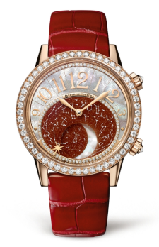積家 Rendez-Vous Moon約會系列月相腕表玫瑰金款呈現(xiàn)奔放熱情的迷人魅力,精致閃耀的表殼宛如一曲獻給璀璨夜空的頌歌。腕表以無限詩意展現(xiàn)大工坊制表大師的精湛技藝,浩瀚縹緲的星空圖案鐫刻于腕表之上,令人沉醉。熱情的火光色彩“鋪滿”玫瑰金表殼之上,紫紅色砂金石表盤呈現(xiàn)北半球的浩渺蒼穹。表盤和表殼均以鉆石鑲嵌,流光溢彩。珍珠母貝打造的一彎明月在浩瀚星空中緩緩移動,與顯示數(shù)字時標的表盤采用相同工藝打造,散發(fā)皎潔光彩。一枚星形指針,以最富詩意的方式提示著佩戴者下一個約會的時間。