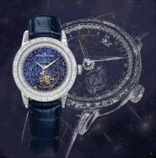 積家 Master Grande Tradition Tourbillon Céleste超卓傳統(tǒng)陀飛輪大師系列星空腕表以讓人目眩神迷的方式詮釋時間。為了充分展現(xiàn)腕表的天文特性,軌道式飛行陀飛輪顯示的為恒星時間而非太陽時間,比太陽時間縮短近四分鐘。在這款腕表的表盤外沿,附帶太陽標志的指針以24小時為一周在表盤上轉(zhuǎn)動。表圈顯示了24小時刻度、黃道十二宮星座與月份。軌道式飛行陀飛輪與星辰和星座同步運轉(zhuǎn),和表盤共演一段恒星之舞。