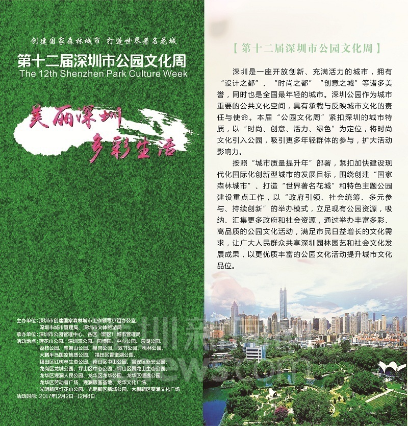 深圳新聞網(wǎng)12月1日訊(記者 鐘鴻冰 通訊員 崔嵩)一年一度的公園文化節(jié)即將到來(lái),12月2日-12月8日,2017年第十二屆公園文化周將在全市27家公園舉行。本屆公園文化周緊密結(jié)合創(chuàng)建“國(guó)家森林城市”和打造“世界著名花城”重點(diǎn)工作,以“美麗深圳 多彩生活”為主題,充分展現(xiàn)美麗宜居的城市環(huán)境及豐富多彩的城市文化生活。