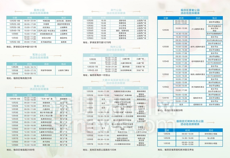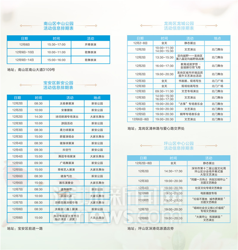 本屆公園文化周共設(shè)27個(gè)會(huì)場(chǎng),其中市屬公園設(shè)11個(gè)會(huì)場(chǎng),區(qū)屬公園設(shè)16個(gè)會(huì)場(chǎng),這也是公園文化周自舉辦以來(lái)承辦會(huì)場(chǎng)最多的一屆。其中,福田區(qū)首次參與公園文化周,該區(qū)紅樹(shù)林生態(tài)公園以及今年新開(kāi)放的香蜜公園均參與了本次活動(dòng)。此外,坪山區(qū)的聚龍山生態(tài)公園,龍華區(qū)的龍華人民廣場(chǎng)、觀(guān)瀾人民公園、龍華公園、德逸公園、勞動(dòng)者廣場(chǎng)均是首次參與“公園文化周”的承辦,讓更多市民在家旁邊就感受到公園文化和公園的建設(shè)成果。