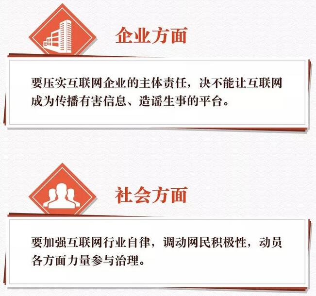 要形成黨委領(lǐng)導(dǎo)、政府管理、企業(yè)履責(zé)、社會(huì)監(jiān)督、網(wǎng)民自律等多主體參與,經(jīng)濟(jì)、法律、技術(shù)等多種手段相結(jié)合的綜合治網(wǎng)格局。要加強(qiáng)網(wǎng)上正面宣傳,積極培育和踐行社會(huì)主義核心價(jià)值觀。