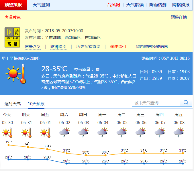 深圳新聞網(wǎng)訊 5月29日鵬城創(chuàng)下近10日新高溫,超過19個氣象站記錄到37度。據(jù)深圳市氣象臺消息,預計30日晴間多云,白天陽光猛烈,最高氣溫35℃,局部可達37℃以上;31日局部有陣雨或雷雨;高溫黃色預警信號預計生效至6月1日,6月1日午后轉(zhuǎn)雷雨,高溫酷熱天氣有望緩解;2-3日大致多云,有陣雨或雷雨。