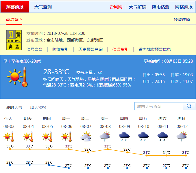 近期天氣方面,預計3日多云間晴天,天氣酷熱,局地有短時陣雨或雷陣雨,氣溫27-33℃,北部和人口密集區(qū)局地最高氣溫可達35℃;4-7日多云,局部有短時(雷)陣雨。請注意持續(xù)高溫下的防暑降溫和戶外活動、戶外作業(yè)的安全;關注局地雷雨的影響,發(fā)布雷電預警時,需遠離高山、開闊的地方以及樹下、較淺的山溝或者山洞、水面等地區(qū)。