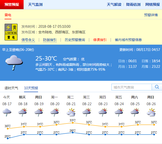 深圳新聞網(wǎng)訊(記者 施冰冰)深圳市氣象臺(tái)預(yù)計(jì),17日深圳多云間陰天,有陣雨,部分時(shí)間雨勢(shì)較大,氣溫26-30℃;18-19日多云,間中有陣雨或雷陣雨;20日起陽光增多,偶有短時(shí)陣雨,天氣趨于炎熱。