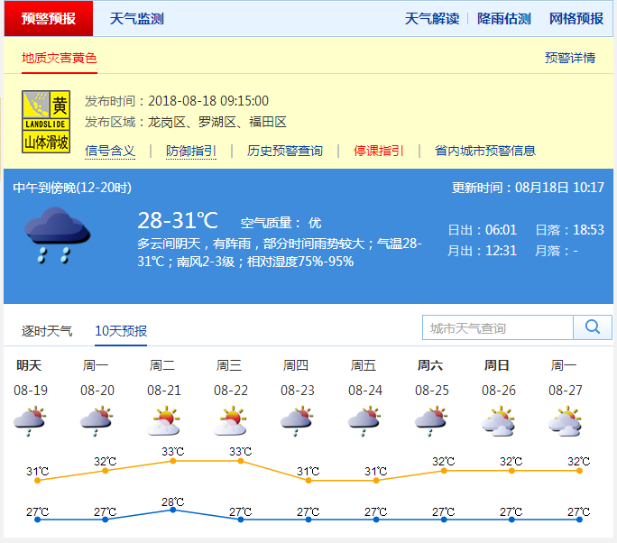 深圳市氣象臺(tái)預(yù)計(jì),18日深圳多云間陰天,有陣雨,部分時(shí)間雨勢(shì)較大,氣溫26-30℃;19日多云有陣雨或雷陣雨;20-23日多云,有短時(shí)陣雨,陽光增多,天氣趨于炎熱。