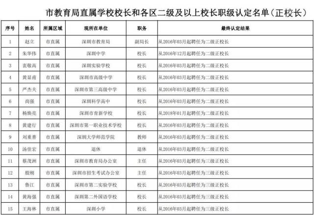 此次公示名單中,職級最高的是二級正校長,特級和一級正校長空缺。此次公示的二級正校長共157人,其中市直屬10人。各區(qū)中,二級正校長最多的是福田區(qū),共有32人,龍崗和寶安緊隨其后,分別有29、27人。羅湖、南山、龍華三區(qū),則分別有19、16和13人。其他各區(qū)的二級正校長均在10人以內(nèi)(大鵬新區(qū)暫無)。