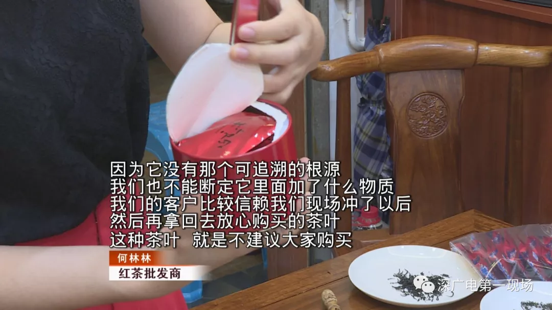 店家介紹,這些看似上檔次的包裝,也不過是最普通的包裝盒,平常大家取茶一般從口上打開有一層一次性包裝紙,但行家一眼便知,賣茶者只是從底部打開分裝的。而茶盒上只顯示茶葉名稱,并沒有生產(chǎn)日期和具體生產(chǎn)廠家信息,屬于三無產(chǎn)品。