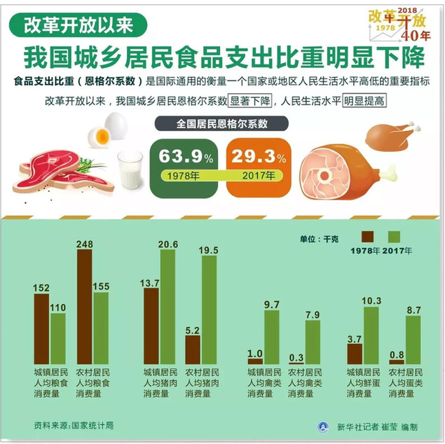 ② 國家統(tǒng)計(jì)局?jǐn)?shù)據(jù)顯示,改革開放以來,我國城鄉(xiāng)居民食品支出比重明顯下降。