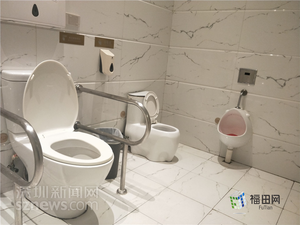 直播的第三站來到福田街道的君尚百貨,突擊檢查商場一樓的廁所。記者看到,君尚百貨的衛(wèi)生間十分明亮寬敞,并且配備了無障礙洗手間和嬰幼兒盥洗室。嬰幼兒盥洗室內(nèi),可以看見小一號的馬桶和小便池,洗手液也安裝在墻面較矮的地方。除此之外,男廁女廁內(nèi)都比較干凈,紙巾、洗手液、烘干機等設(shè)備齊全,隔間地面干凈,沒有發(fā)現(xiàn)臟污的地方。