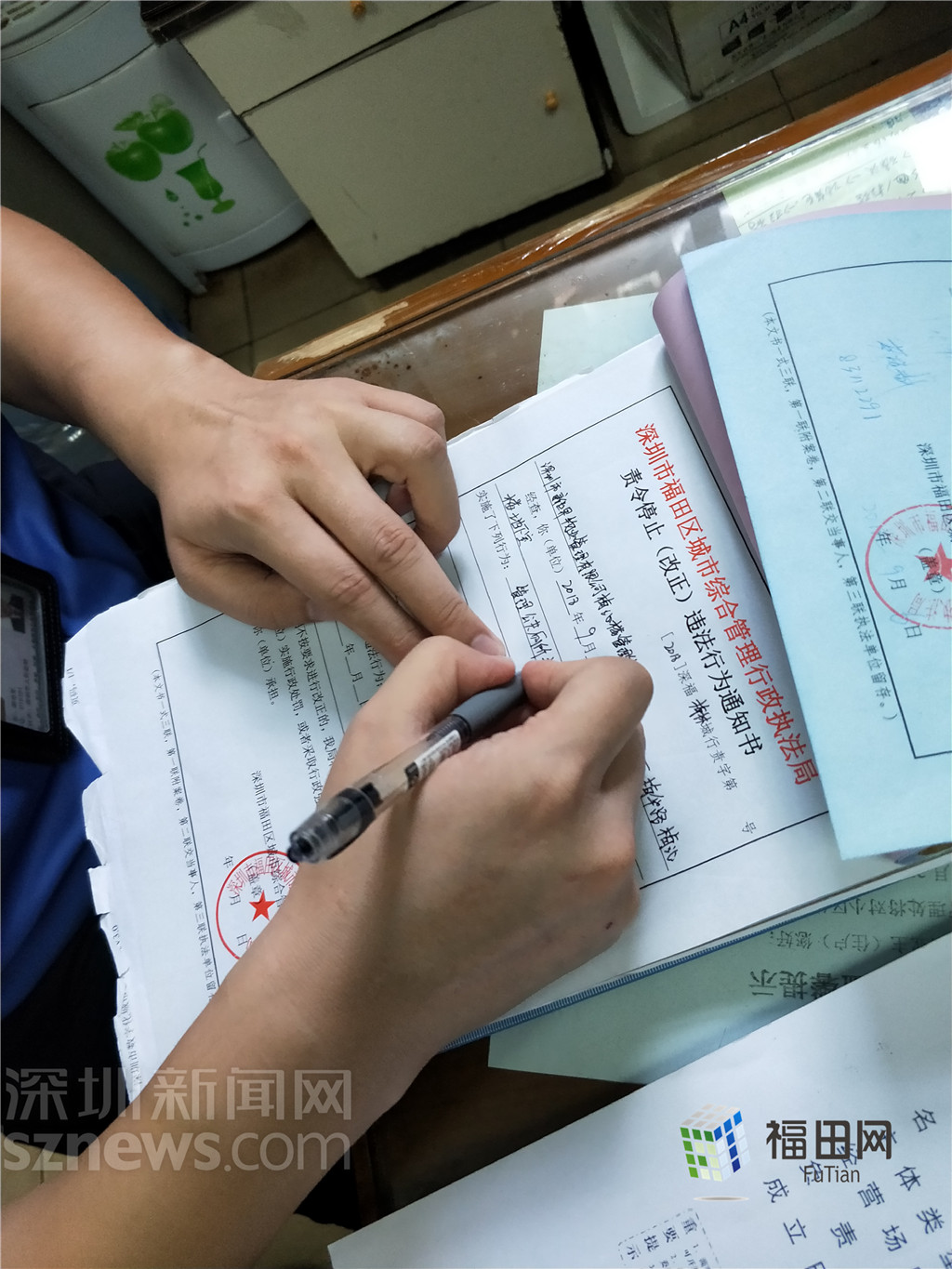 福田街道執(zhí)法隊(duì)給購(gòu)物公園管理處開(kāi)具責(zé)令停止(改正)違法行為通知書(shū)。