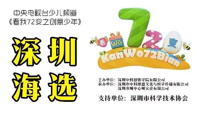 9月15日(本周六),央視“看我72變”欄目組將聯(lián)合深圳市科學(xué)技術(shù)協(xié)會(huì)、深圳市中心書城、中科創(chuàng)造力實(shí)驗(yàn)室,在中心書城大臺(tái)階舉辦第10屆“看我72變”之創(chuàng)意少年(深圳賽區(qū))的海選。只要你的孩子有創(chuàng)意有想法,都可以來到中心書城參加海選,發(fā)揮自我創(chuàng)意,結(jié)識(shí)新朋友。征集節(jié)目類型包括但不限于藝術(shù)創(chuàng)意表演:舞蹈、音樂、書法、輪滑、體育類等,科技創(chuàng)意:科技作品展示等,優(yōu)勝者將有機(jī)會(huì)登陸央視舞臺(tái)參加節(jié)目錄制。
