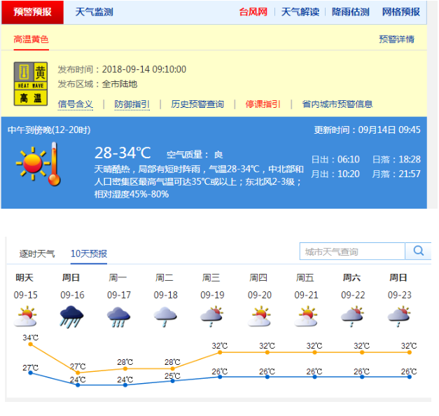 【深圳市高溫黃色預警】深圳市氣象臺于2018年09月14日09時10分在全市陸地發(fā)布高溫黃色預警,預計14日我市最高氣溫將升至35℃以上,信號可能持續(xù)2天,做好防暑降溫工作,避免長時間戶外或者高溫條件下的作業(yè)。