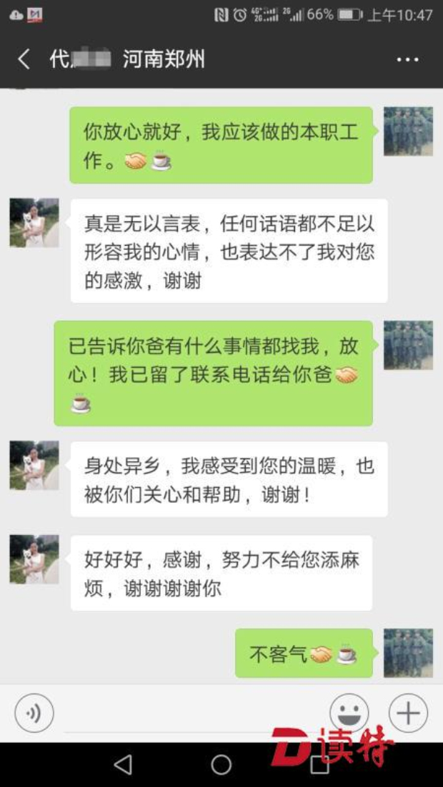 早上7時50分許,口岸派出所巡邏民警陳譚海終于在火車站廣場外的小店中找到了老人,隨即將其接到派出所,隨后由口岸派出所民警晏紅衛(wèi)將其送到轄區(qū)濱河中學的緊急避難所予以妥善安置,目前老人的身體健康狀況良好,并與其女兒代女士取得了聯(lián)系。