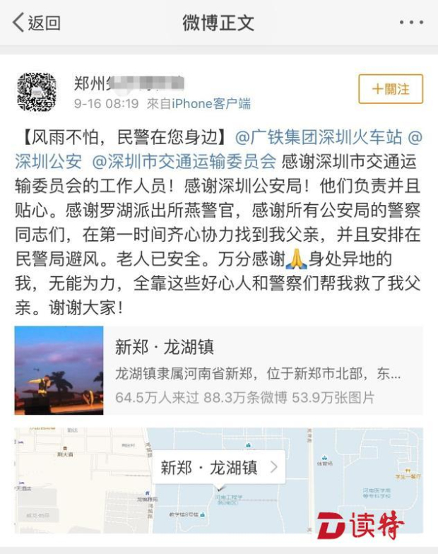 原標題:臺風天老人坐不上火車,和在河南的女兒失聯(lián)!深圳警方徹夜尋找