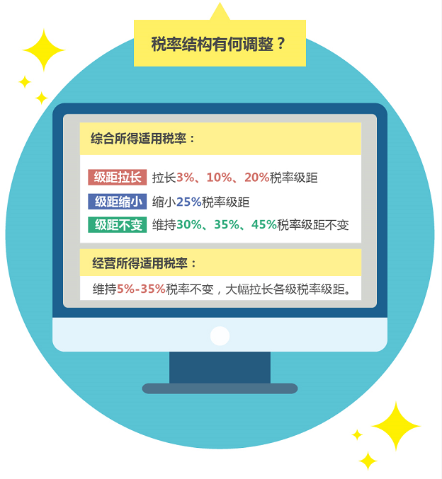 在稅率表的調(diào)整上,此次改革將更多地惠及中低收入群體,對(duì)勞動(dòng)性所得,以現(xiàn)行工薪所得3%-45%七級(jí)超額累進(jìn)稅率為基礎(chǔ),拉大3%、10%、20%三檔低稅率的級(jí)距,對(duì)經(jīng)營(yíng)性所得,在維持現(xiàn)行5%-35%五級(jí)超額累進(jìn)稅率的基礎(chǔ)上,也適當(dāng)擴(kuò)大了各檔次稅率級(jí)距,減輕了廣大經(jīng)營(yíng)業(yè)主的稅負(fù)。