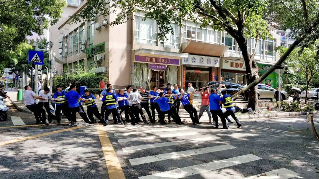 9月19日上午,福田區(qū)百花二路、三路,60多名身著藍色制服的警察和紅色馬甲的輔警格外顯眼,他們正在揮汗如雨地進行災(zāi)后路障清理工作。