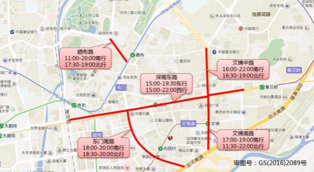 曬布路(11:00-20:00南行,17:30-19:00北行),深南東路(15:00-19:30東行,15:00-22:00西行),文錦中路(16:00-22:00南行,16:30-19:00北行),文錦南路(17:00-19:00南行,11:30-22:00北行),東門南路(18:00-20:00南行,18:30-20:00北行)。