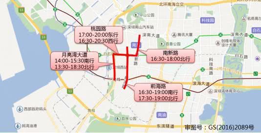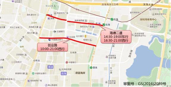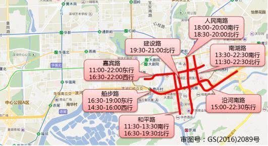 華強(qiáng)北路(13:30-17:00南行,10:00-17:30北行),華富路(17:00-21:00南行,16:00-17:30北行),振華路(16:00-19:00東行,13:30-22:30西行),上步中路(15:00-17:00北行),深南中路(16:00-19:00東行),上步南路(10:00-19:30南行,13:00-15:00北行,19:30-22:00北行)。