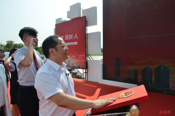 9月21日上午,深圳市普法辦、深圳市司法局和深圳廣電集團在深圳人才公園潮汐廣場舉辦2018年“新深圳人”向《中華人民共和國憲法》宣誓儀式,深圳市政協(xié)副主席黎軍監(jiān)誓,深圳市司法局局長蔣溪林帶領(lǐng)20名“新深圳人”代表面對憲法莊嚴宣誓。市民向憲法宣誓,在全國尚屬首次。