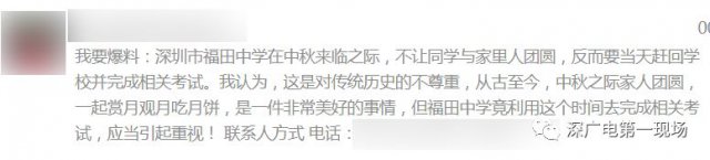 今天,深圳市高級中學(xué)、深圳市福田中學(xué)、沙井中學(xué)、東方英文書院的一些高中學(xué)生,通過在線留言等多種方式,向欄目反映,中秋節(jié)是法定假日,但他們卻沒法和家人一起吃飯團聚,更別提賞月看晚會了,原因是學(xué)校要求寄宿的學(xué)生今天晚上要提早返校,參加晚自習(xí)或者考試。