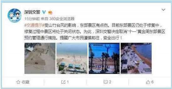 今日(9月25日)深圳市交警局宣布,由于臺(tái)風(fēng)"山竹"對(duì)東部景區(qū)破壞嚴(yán)重,目前部分景區(qū)仍在搶修中。交警蜀黍經(jīng)過綜合考慮,決定取消國慶期間前往東部的預(yù)約措施。