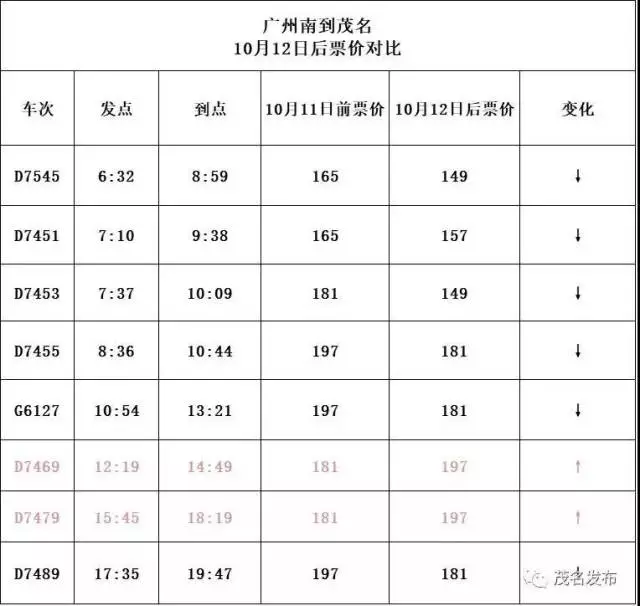 D7451次(7點10分班次)由原來的206元調(diào)整為196元;