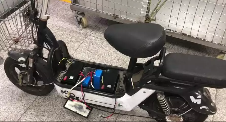 “當(dāng)時(shí)看到這名旅客電單車的腳踏板位置比車身其他位置要干凈一些、新一些,就進(jìn)行了檢查。檢查發(fā)現(xiàn)腳踏板可以直接掀起來(lái),里面的電池盒外表也比較新,這就不太正常了。”現(xiàn)場(chǎng)關(guān)員介紹道。隨后,關(guān)員對(duì)電動(dòng)單車電池盒進(jìn)行了拆卸。