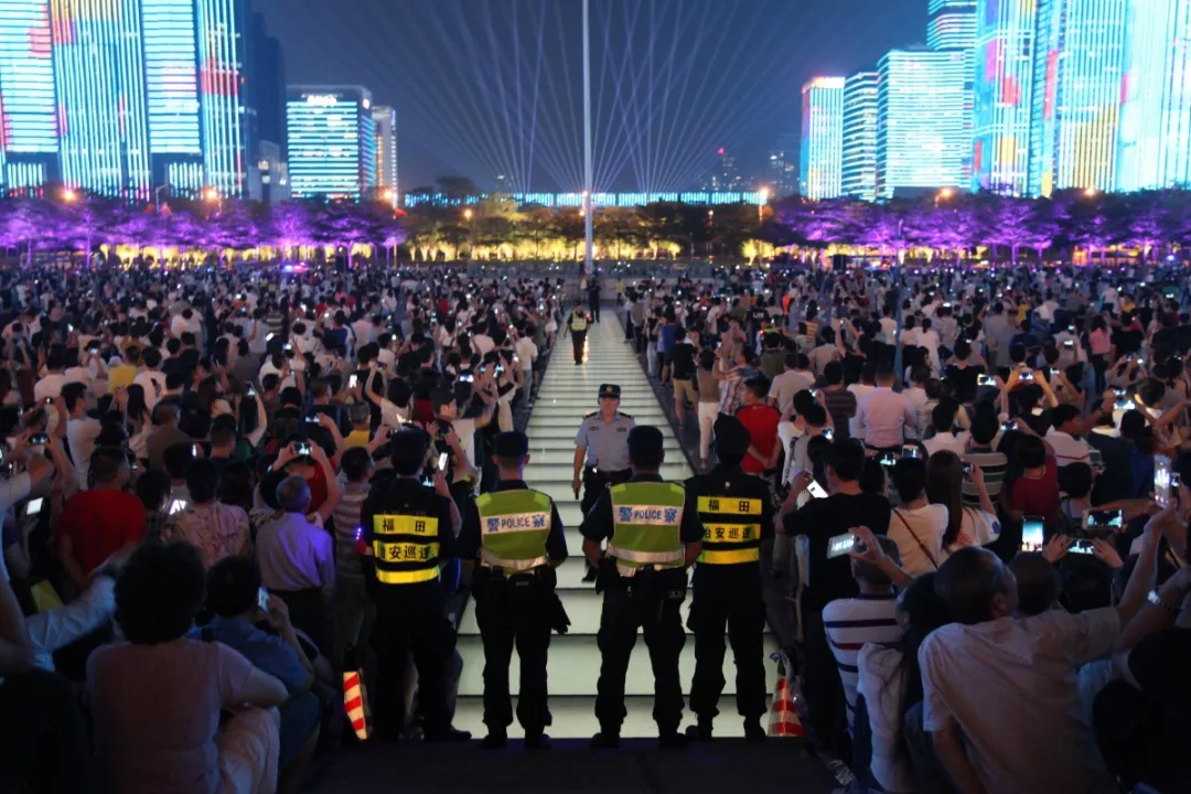 “燈光秀”活動正式表演首日,現(xiàn)場觀演人數(shù)約54300人,福田公安分局出動1000名警力在現(xiàn)場及周邊維持秩序,確?;顒禹樞蚺e行。