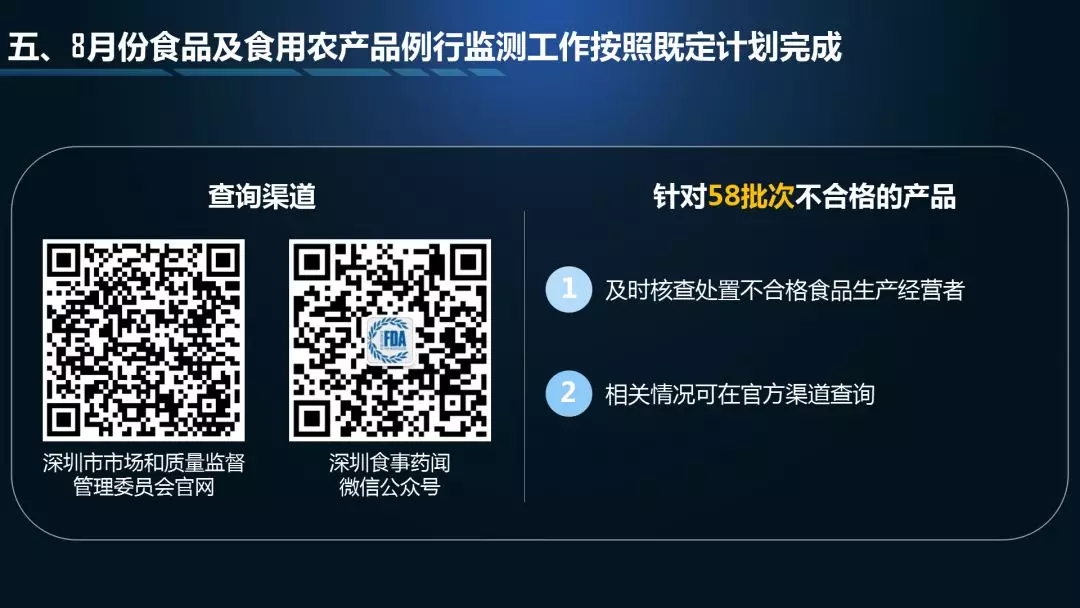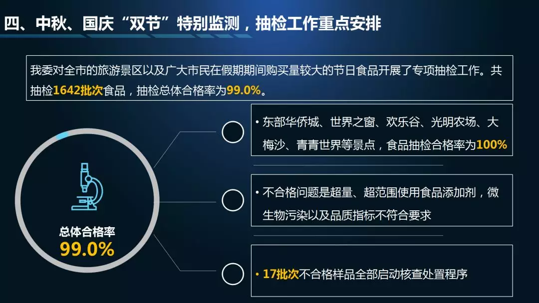 第二個(gè)“3”是三項(xiàng)檢測(cè)結(jié)果通報(bào),分別是中秋、國(guó)慶的特別監(jiān)測(cè)通報(bào),8月份食品例行監(jiān)測(cè)通報(bào),8月份食用農(nóng)產(chǎn)品例行監(jiān)測(cè)通報(bào);
