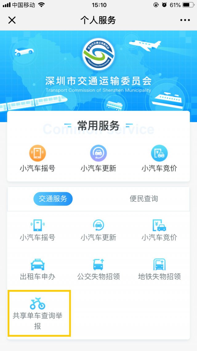 關(guān)注并進(jìn)入「深圳交委」微信公眾號(hào);點(diǎn)擊「便民服務(wù)」菜單欄 &;在「交通服務(wù)」分類(lèi)下就可以找到「共享單車(chē)查詢舉報(bào)」功能了!