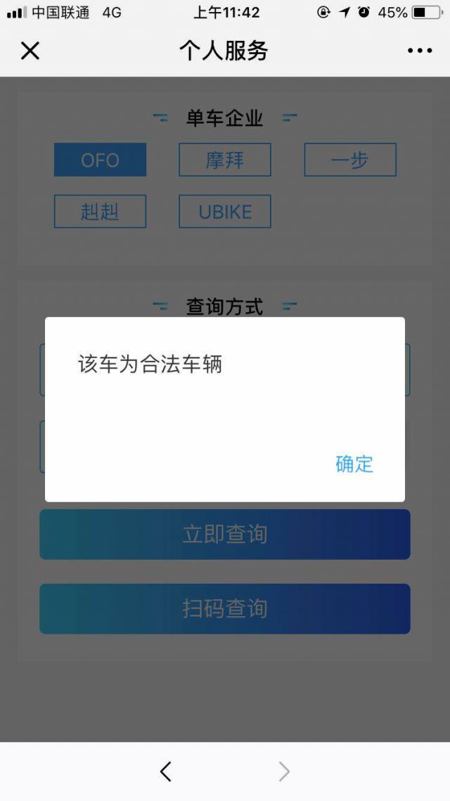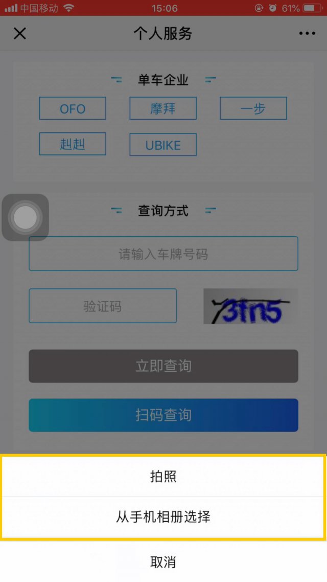 提交完手機(jī)號(hào)和驗(yàn)證碼之后,我們就來(lái)到了這個(gè)頁(yè)面,在這里,你可以選擇你要查詢的共享單車的品牌,品牌選擇完畢后,你可以選擇手動(dòng)輸入車牌號(hào)碼或掃碼查詢!