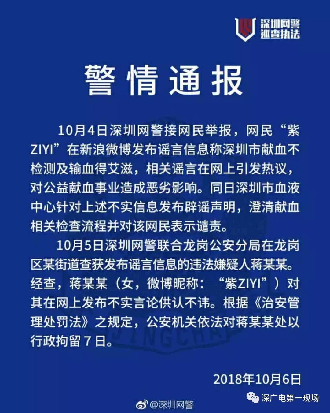 10月4號,微博名為“紫ZIYI”網(wǎng)友在微博上發(fā)布了“深圳獻血不檢測、輸血得艾滋”的消息一言激起千層浪,言論被廣泛傳播。
