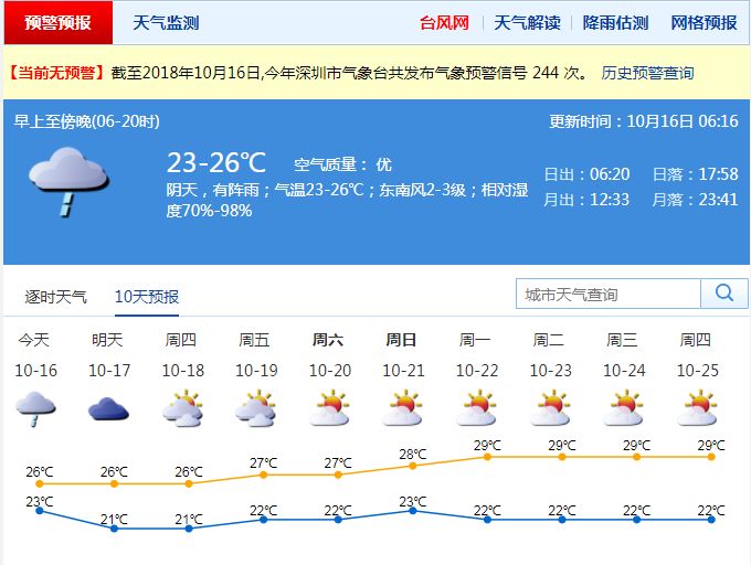 深圳市氣象局提醒,16日 ~17日陰天有雨,雨天路面濕滑能見度差,對(duì)交通影響較大,需注意防范降雨對(duì)上班高峰期帶來(lái)的不利影響。預(yù)計(jì)17日重陽(yáng)節(jié)早晨仍有分散小雨,路面濕滑,戶外登高要注意防滑保暖。