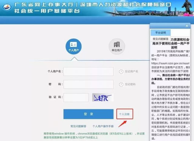 注冊(cè)成功后返回操作系統(tǒng)登錄,輸入用戶名和密碼進(jìn)入個(gè)人網(wǎng)頁。注冊(cè)條件需要有12家銀行(金融社保卡合作銀行)的深圳開戶的銀行賬號(hào)。