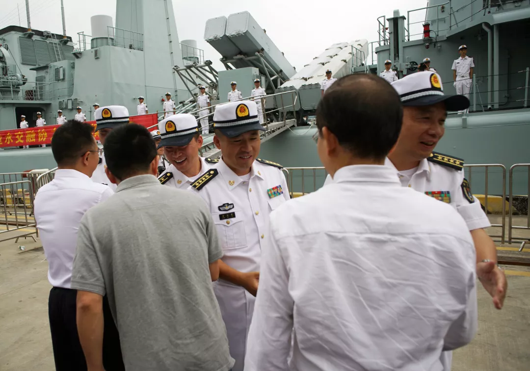 深圳市委副秘書長劉平生,市民政局局長廖遠飛,南山區(qū)委常委、宣傳部部長廖子彬,南山區(qū)委常委、人武部部長彭耀玖,副區(qū)長謝炳文等領導代表市、區(qū)雙擁辦在碼頭上歡送深圳艦。南部戰(zhàn)區(qū)海軍副參謀長李曉巖少將,深圳艦所在某驅逐艦支隊副政委蔣軍大校,深圳艦艦長黃北奇大校,深圳艦政委陳永強上校等與深圳親人一一握手道別。