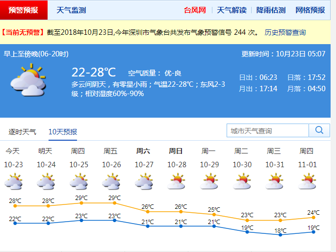 深圳新聞網(wǎng)訊 今年冷空氣來得較早,進入10月以來,已有幾輪弱冷空氣影響深圳,天氣明顯轉涼。預計本周深圳大致多云,最低氣溫21℃至23℃,今日深圳陰天間多云,有分散小雨,27日受冷空氣影響,氣溫略降。近期早晚清涼,市民要及時添衣保暖。