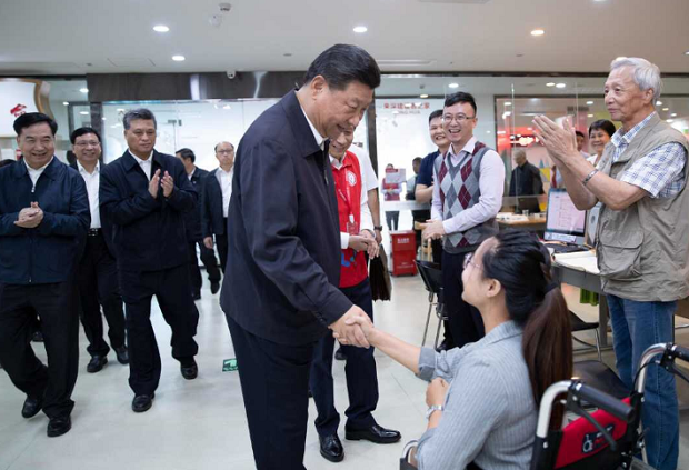 24日上午,社區(qū)居民張瑩瑩正在社區(qū)圖書館查閱資料,習(xí)近平總書記向她走來,與她親切交流。張瑩瑩5歲的時候因?yàn)樾郝楸园Y落下了腿疾,行動不便。她告訴總書記,社區(qū)有300多名殘疾人士,這里有專門為殘疾居民設(shè)計的戶型。