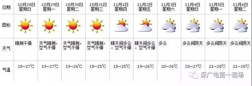 28日到11月1日持續(xù)晴朗干燥,28日氣溫20-27℃;11月2日起云量逐漸增多?;痣U預警信號將持續(xù)生效,建議做好防火安全管理。