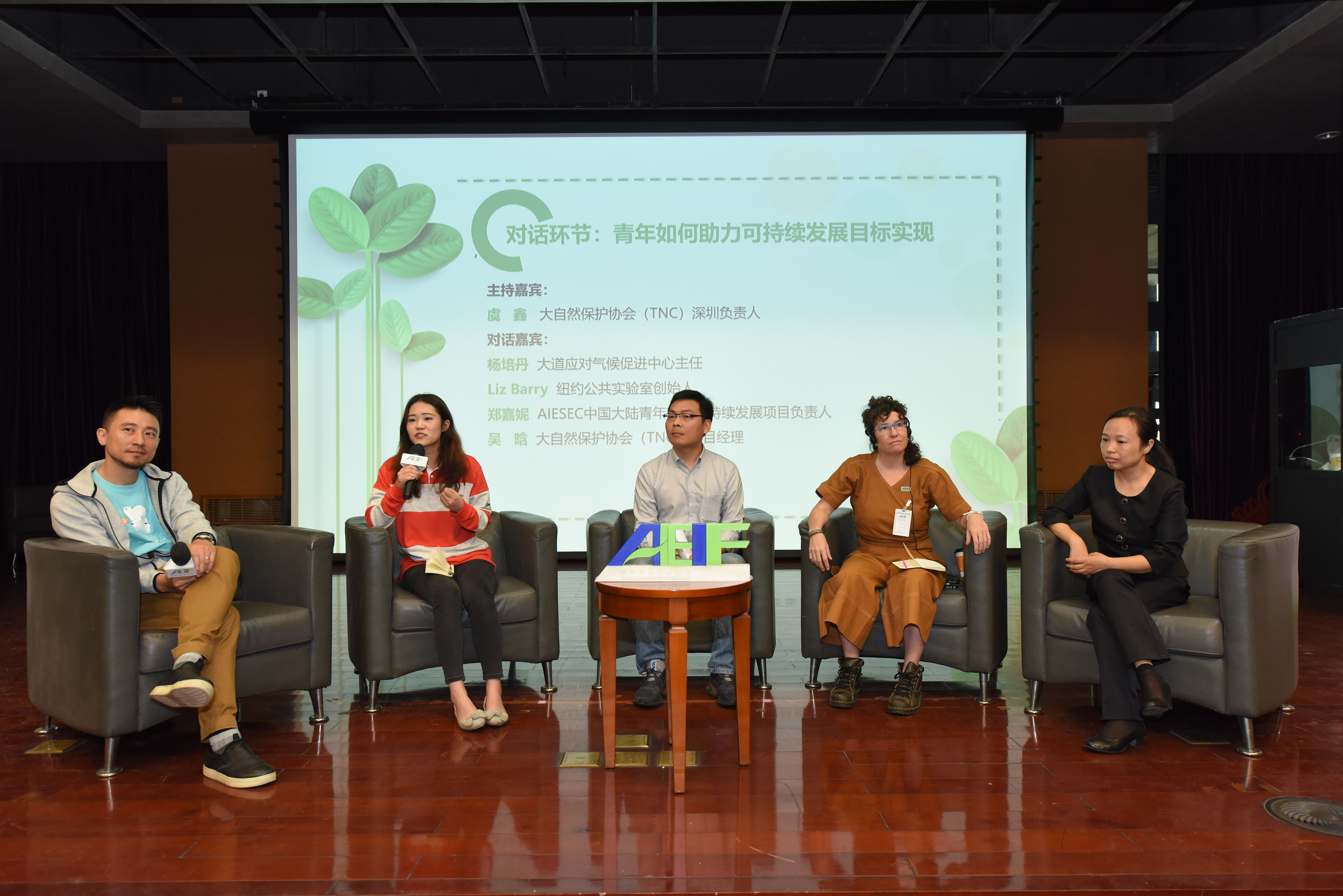 對話環(huán)節(jié)“青年如何助力可持續(xù)發(fā)展目標(biāo)實(shí)現(xiàn)”共有6位嘉賓參與。在主持嘉賓大自然保護(hù)協(xié)會(TNC)深圳保護(hù)項(xiàng)目負(fù)責(zé)人虞鑫先生的帶領(lǐng)下,大道應(yīng)對氣侯促進(jìn)中心主任楊培丹、紐約公共實(shí)驗(yàn)室創(chuàng)始人Liz Barry、AIESEC中國大陸青年獻(xiàn)力可持續(xù)發(fā)展項(xiàng)目負(fù)責(zé)人鄭嘉妮、大自然保護(hù)協(xié)會(TNC)項(xiàng)目經(jīng)理吳晗參與了分享交流。
