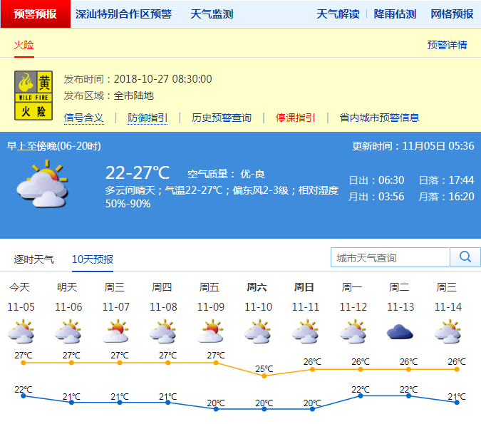 5日,深圳將以多云天氣為主,部分時(shí)間可見陽(yáng)光。白天氣溫回升,最高氣溫在27度左右。早晚天氣清涼,最低氣溫在22度左右,溫差增大,市民應(yīng)注意預(yù)防疾病。