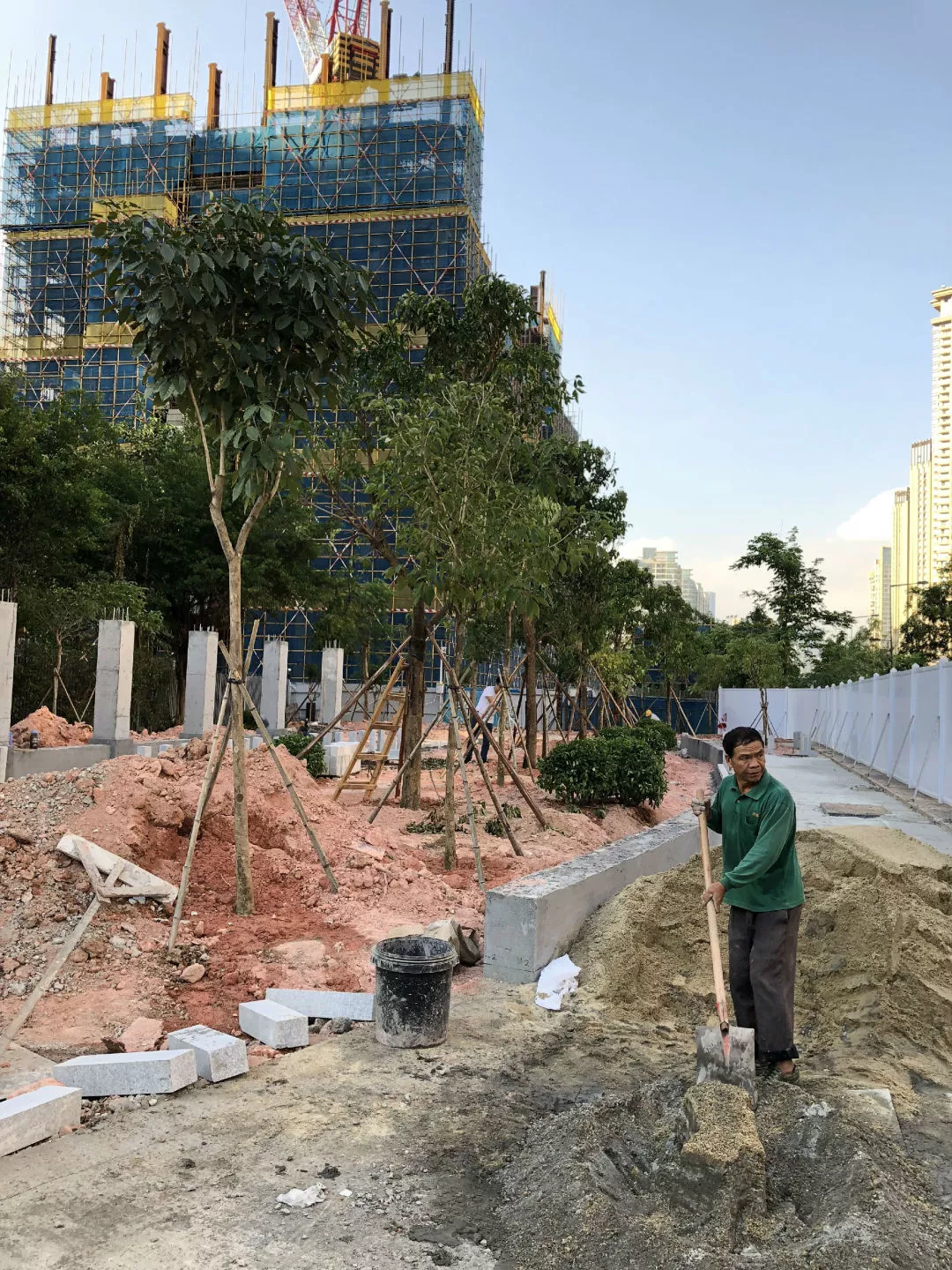 ▲街心公園施工中昨日下午,記者先后來到三個正在建設(shè)的街心公園走訪,大鏟社區(qū)街心公園、東角頭地鐵站A/B廣場(街心公園)剛剛動工,而后海濱路街心公園雛形初顯,公園路面已經(jīng)修好,工人正在種植喬木。