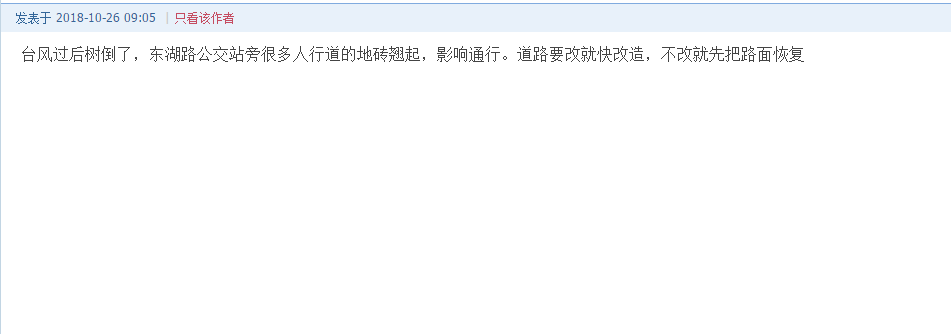 “再補(bǔ)一張,到2019年啦?!痹摼W(wǎng)友在發(fā)帖后的幾小時內(nèi),又補(bǔ)發(fā)了一張寫有“2019年實(shí)施,2019年完工”的截圖。并配圖表示“臺風(fēng)過去快2個月了,東湖路的人行道石磚仍大片凸起,地鐵站前面的道路凹凸不平,從來沒有人來處理?!?/p>