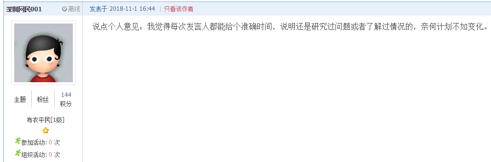 縱觀該帖文,網(wǎng)友將2017年以來的文字截圖一一呈現(xiàn),“有圖有真相”的質(zhì)疑羅湖區(qū)相關(guān)政府部門。但,就如上圖網(wǎng)友所言,不管面對何事,都應(yīng)當(dāng)讓“理解”先行。只是當(dāng)市民給予了一定理解之后,也希望相關(guān)部門信守承諾,盡量避免屢次爽約,畢竟政府部門的信用是靠其一言一 行來建立的。