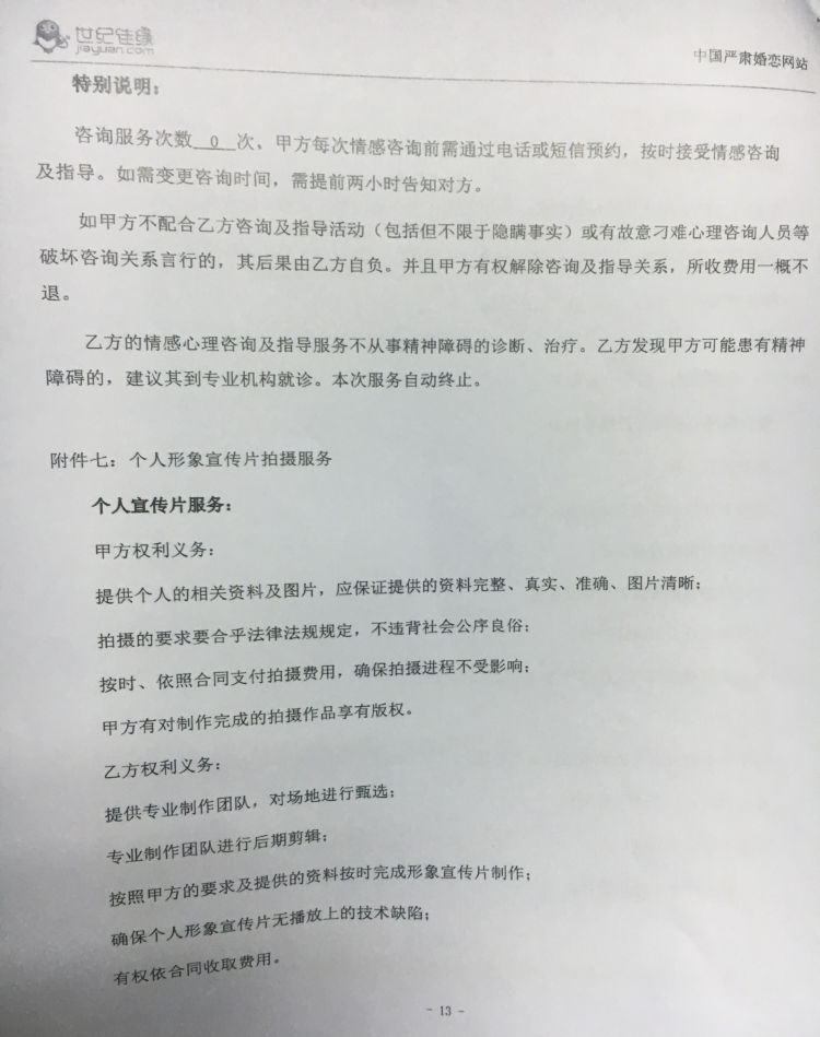 今年2月27日,劉小姐與世紀(jì)佳緣簽訂了一份繳款4.88萬的紅娘服務(wù)合同。合同服務(wù)期限為8個(gè)月,合同將根據(jù)其擇偶標(biāo)準(zhǔn),由系統(tǒng)推薦60位候選人,其中紅娘協(xié)助線下約會(huì)安排8人次。此外,合同還包含三項(xiàng)增值服務(wù),包括整體形象設(shè)計(jì),專家咨詢、情感分析服務(wù)和個(gè)人宣傳片服務(wù)。